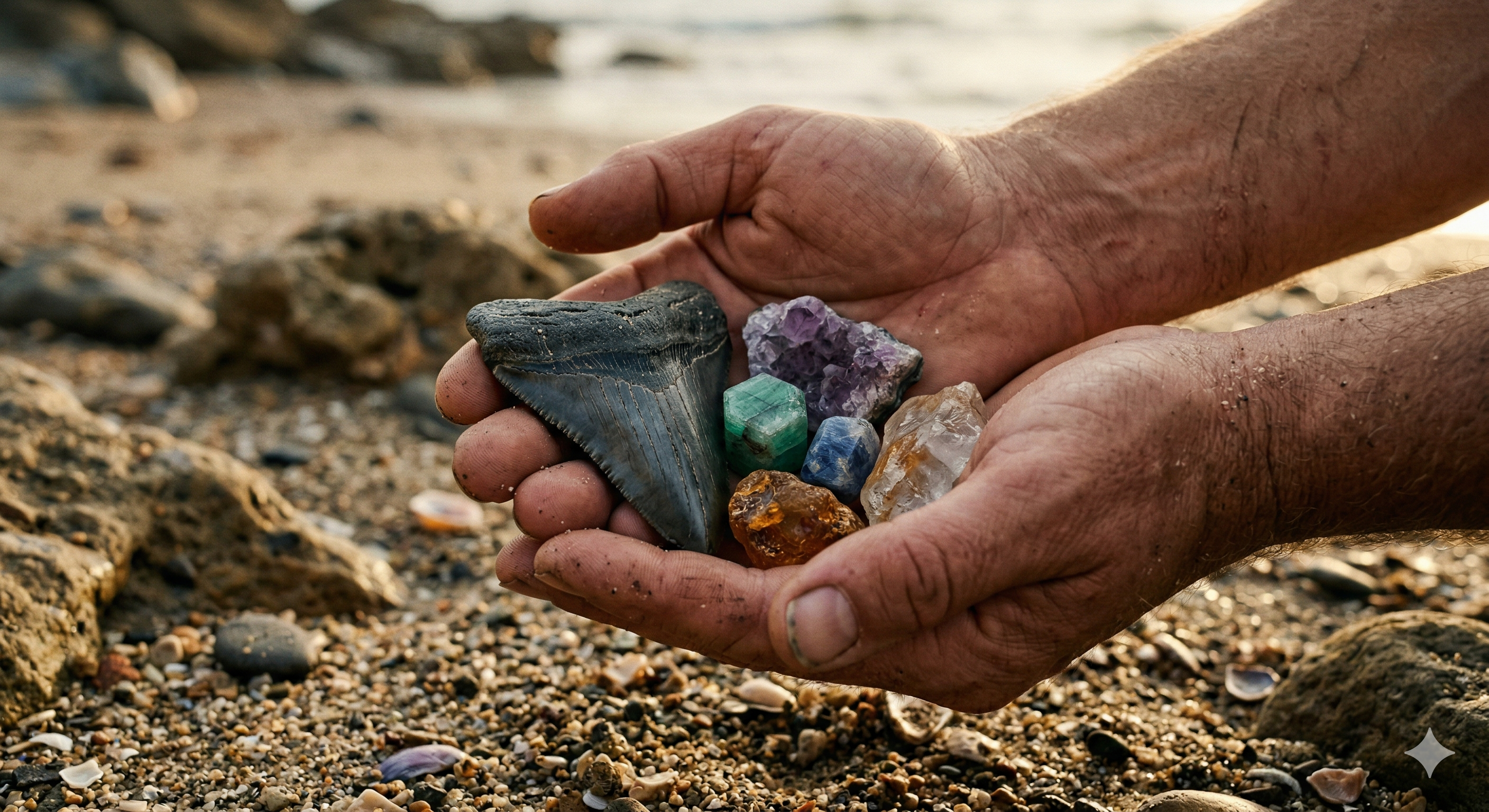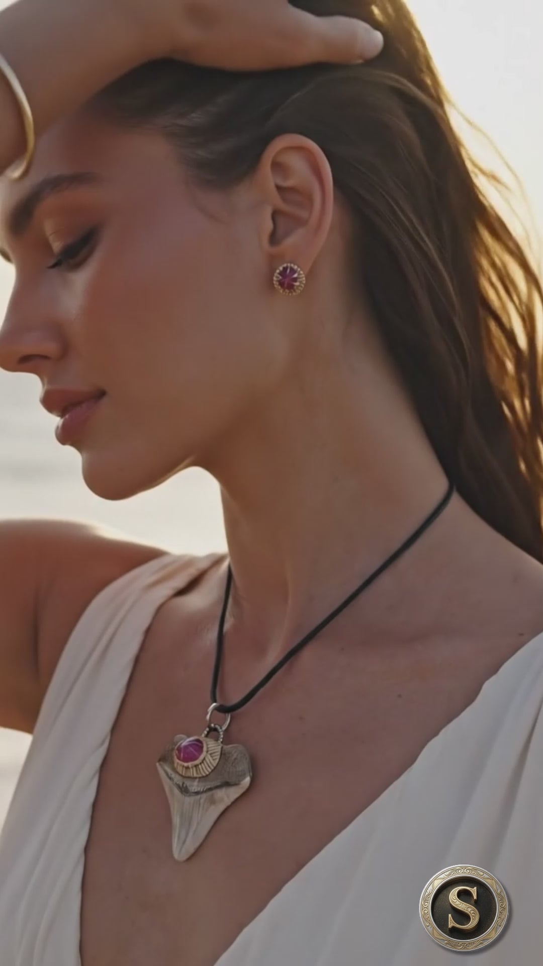 Handcrafted fossil shark teeth jewelry, each piece uniquely adorned with precious gemstones.